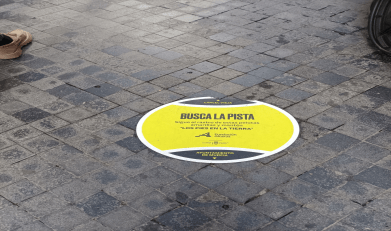 Caminando por el centro de la ciudad junto a la Catedral, me sorprendió encontrar unas pegatinas en el suelo que así decían : «Busca la pista……… Sigue el rastro de estás �� �� �� �� ….. amarillas y mantén «LOS PIES EN LA TIERRA».