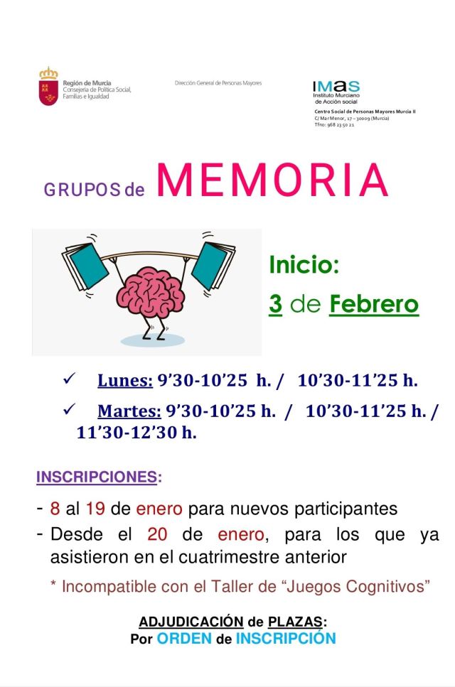 Nuevos grupos de MEMORIA a partir de febrero en 2 enero, 202511 diciembre, 2024 por Usuari@s CM Murcia IIen Nuevos talleresDeja un comentario ATENCIÓN A LAS FECHAS DE INSCRIPCIÓN Comparte:Me gusta Cargando...