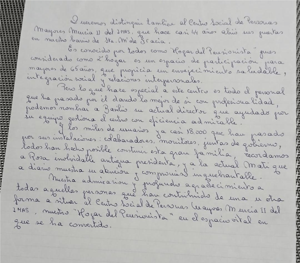 Queremos distinguir también al C.S.P. Murcia II,que hace casi 44 años abrió sus puertas en nuestro barrio de Santa Maria de Gracia. Esconocido de todos como «Hogar del Pensionista» pues como considerado como 2º hogares un espacio de participación para mayores de 65 años, que propicia un envejecimiento saludable, integración social y relaciones interpersonales.