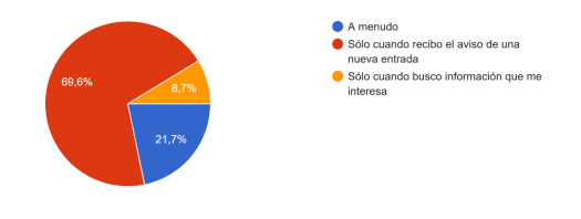 A la pregunta, ¿cada cuánto visitas el Blog? , la mayoría indica que lo hace cuando recibe un aviso de que se ha publicado una nueva entrada, mientras que una parte más pequeña lo visita a menudo, sin necesidad de recibir el aviso.