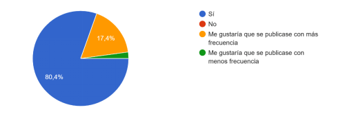 A la pregunta ¿estás satisfecho/a con la frecuencia con la que se publican entradas?, vemos que nadie está insatisfecho con la frecuencia, pero un porcentaje muy amplio sí lo está.