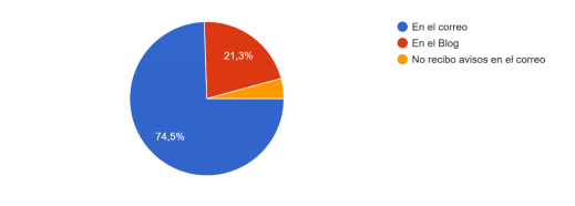A la pregunta ¿Cuándo recibes el aviso de una entrada nueva, la lees en el correo o abres el Blog para ello?, casi tres cuartas partes de las respuestas indican que leen las entradas desde su mismo correo, sin llegar a acceder a la página del Blog.