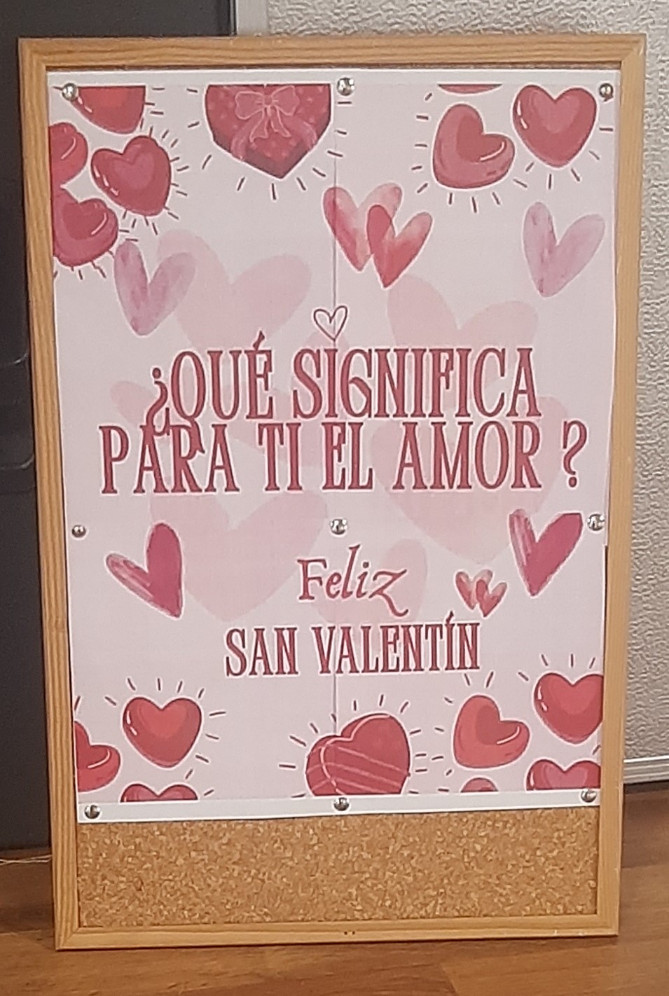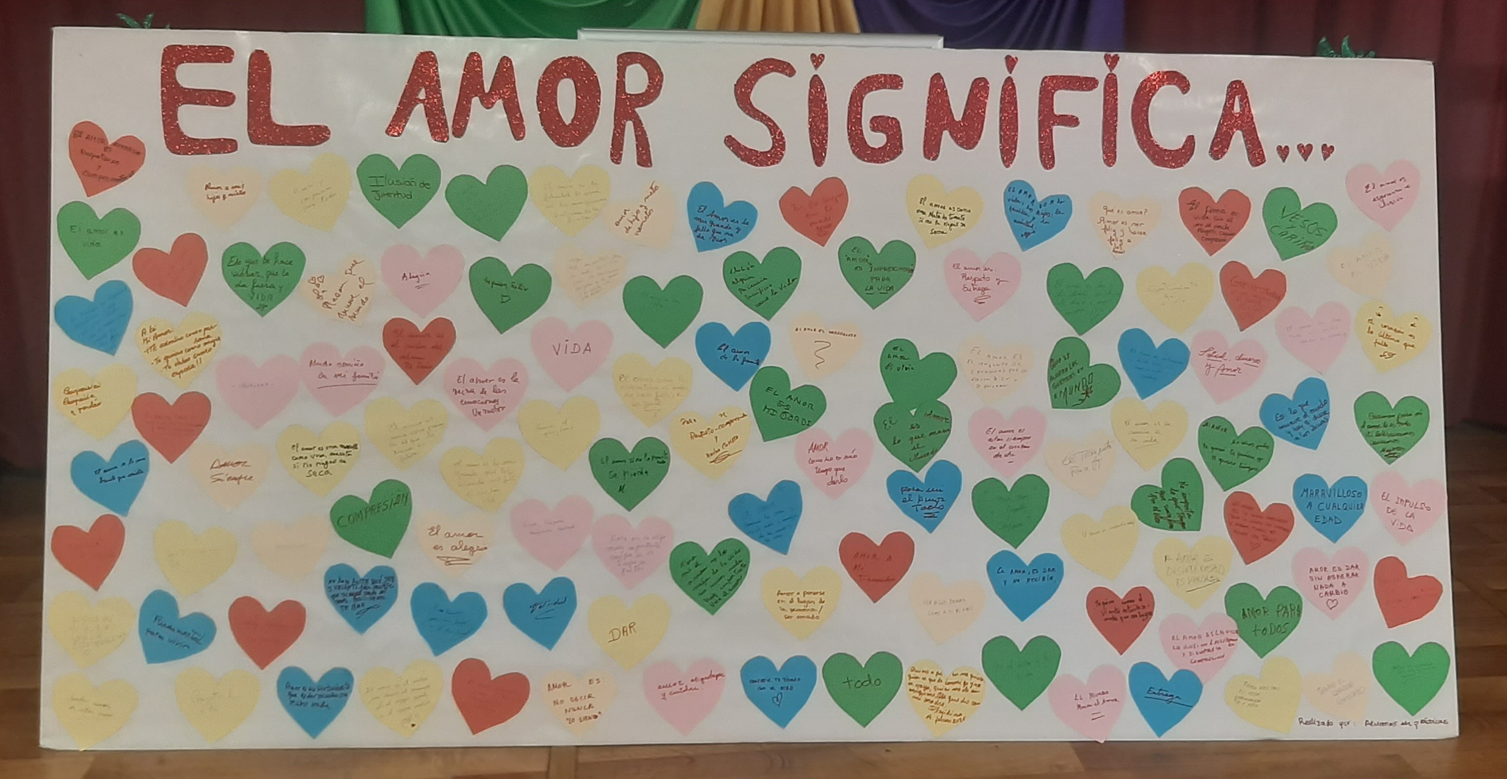 A la entrada del Centro las alumnas le preguntaban a los usuarios si querían apuntar que significaba para ellos el Amor y así aquel que quería lo escribía en unas cartulinas recortadas con forma de corazón y se pegaba en un cartel que después se ha expuesto en el centro.