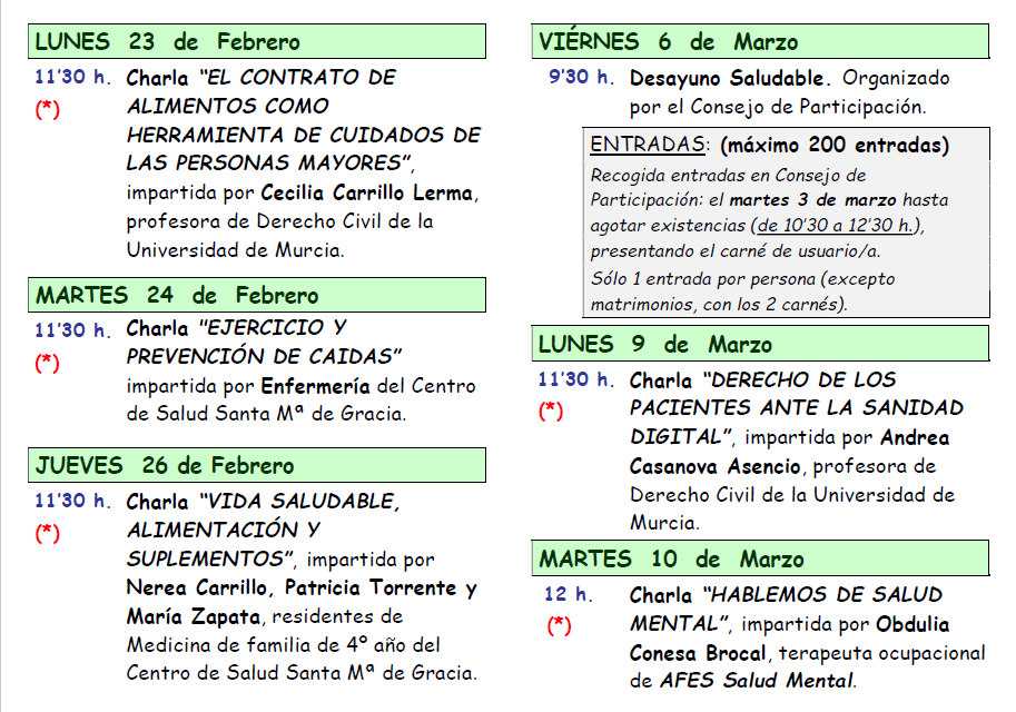 Todos los lunes y miércoles a las 11,30 horas cada semana de Febrero a Mayo.