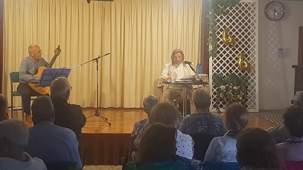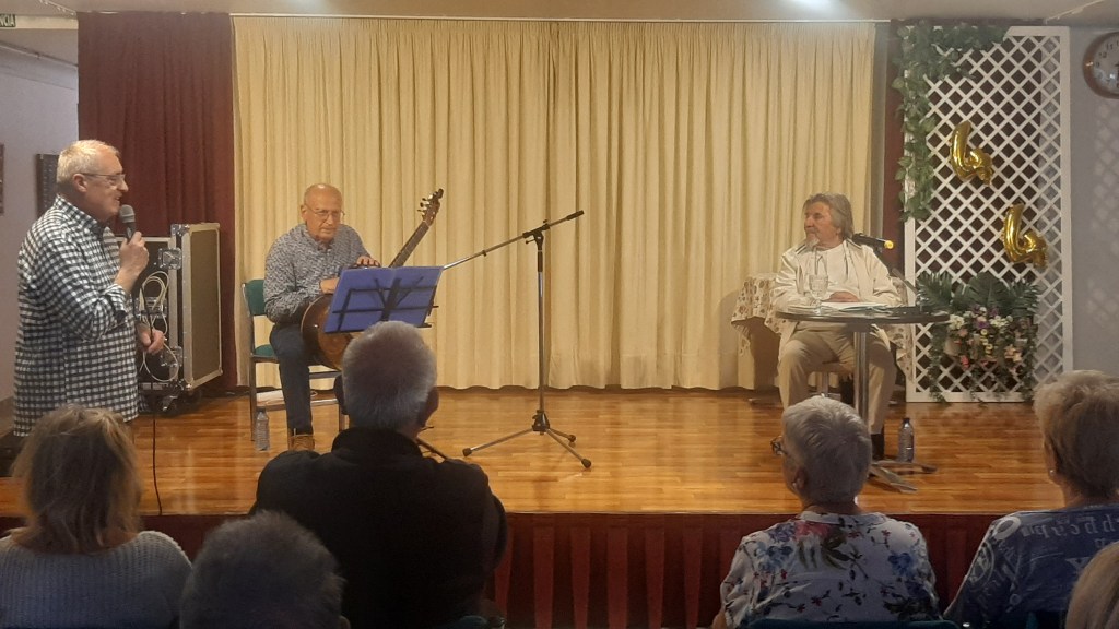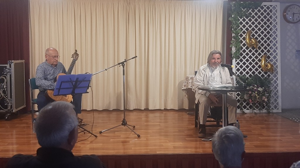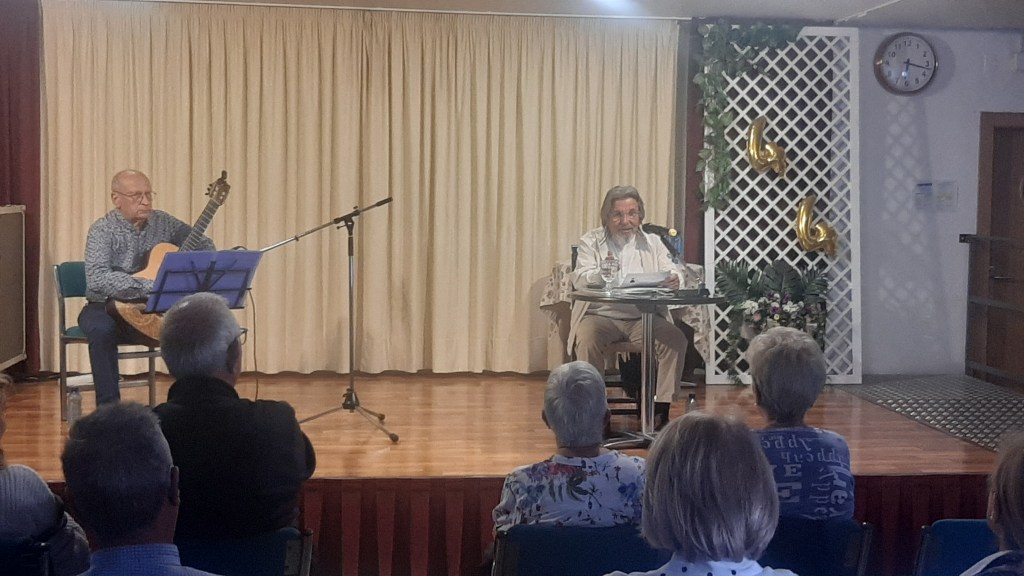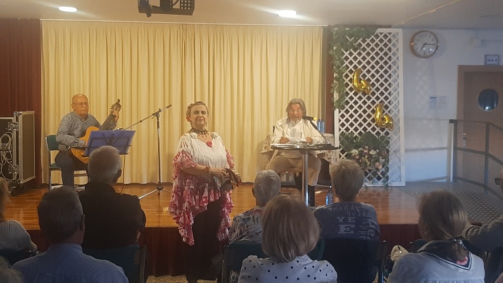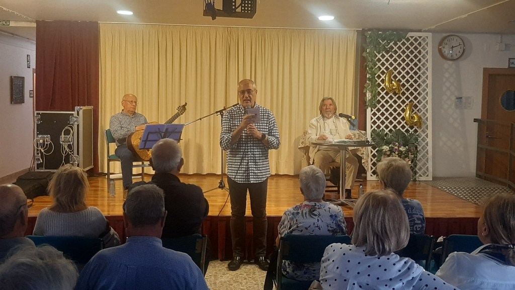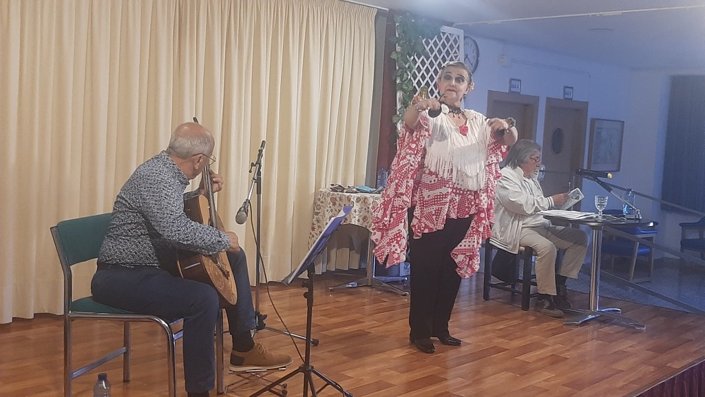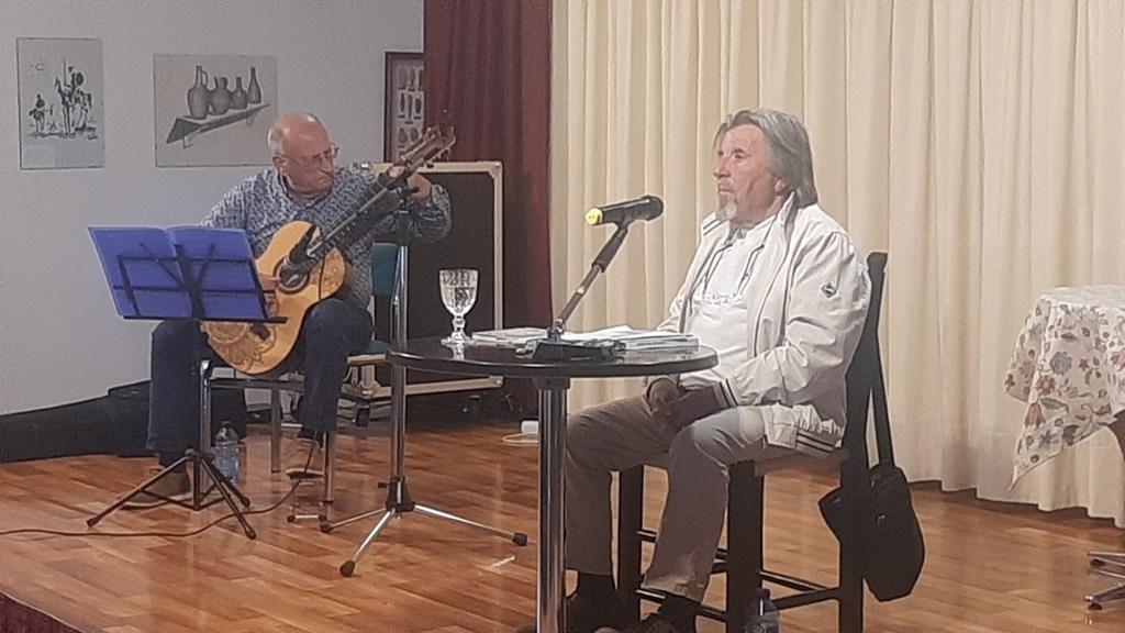 El Lali empezó su recital, ya que Mª Dolores llegaba con un poco de retraso, declarando diversos poemas sobre temas actuales (guerra, maltrato a mueres) y con poemas ya mas tradicionales, siempre acompañados con música de guitarra de Pedro Antonio.