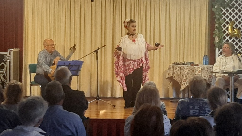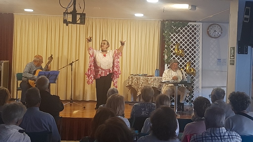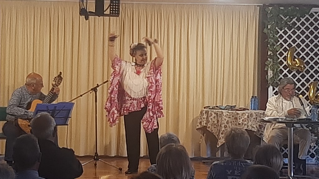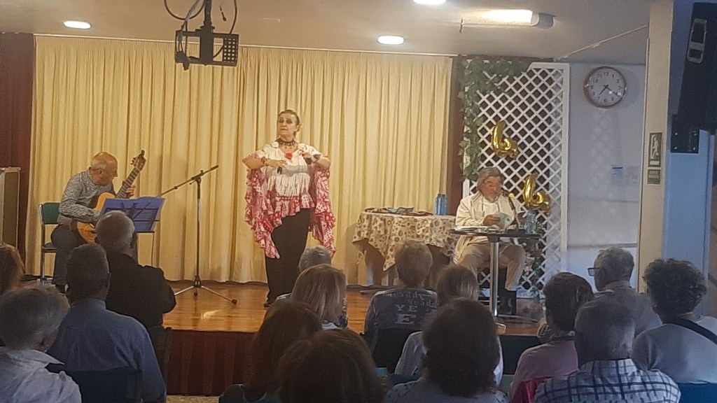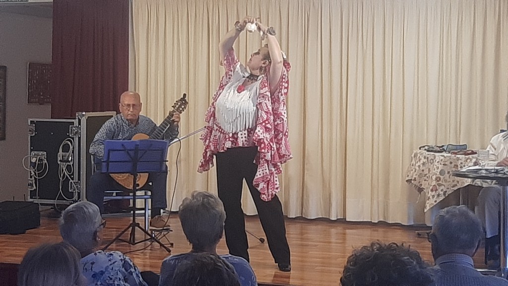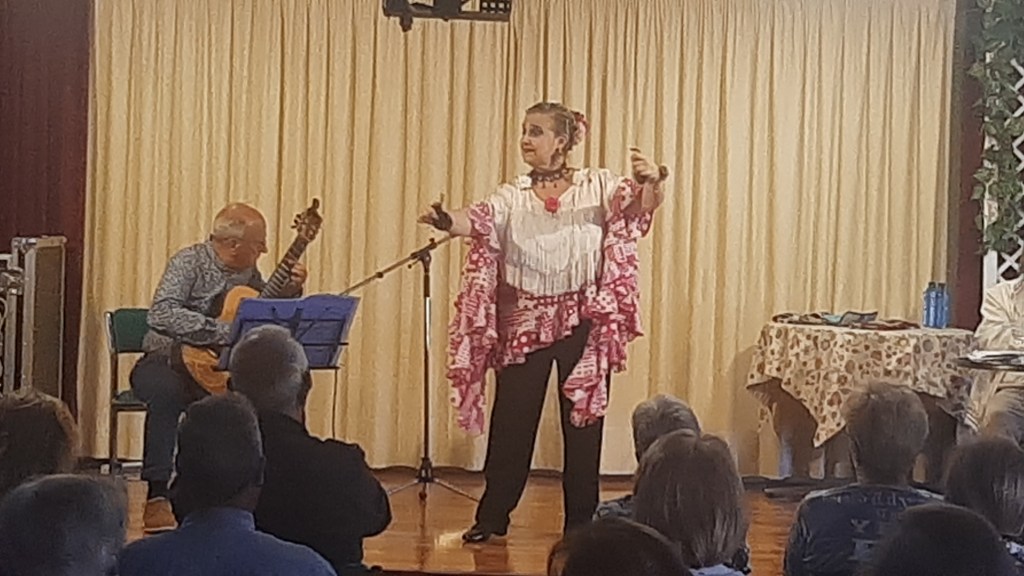 Posteriormente, Mª Dolores empezó con su recital con varias melodías acompañando a al guitarra con sus castañuelas y postizas, como al evento asistieron algunas alumnas suyas, las hizo participes de alguna melodía también tocando con ella.