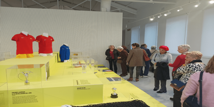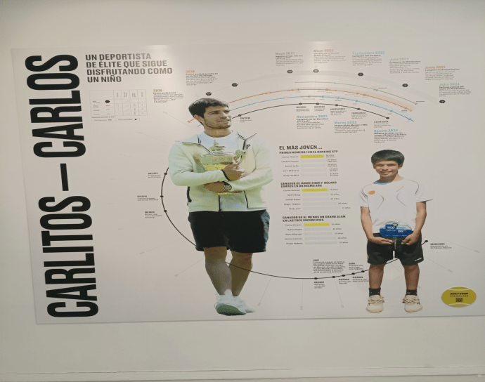 El recorrido guiado continúa con la exhibición de los trofeos del tenista, camisetas, zapatillas adaptadas a las distintas pistas y otros objetos personales directamente relacionados con las competiciones a las que ha ido haciendo frente a lo largo de su trayectoria profesional y el desarrollo de su vida personal que visualizamos en un mural.